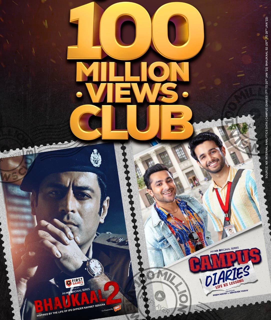 यूथ ड्रामा कैम्पस डायरीज़, जो इस महीने की शुरुआत में रिलीज हुई थी, ने लॉन्च के दो हफ्तों में एमएक्स प्लेयर पर 100 मिलियन व्यूज को पार कर लिया है। इसके साथ ही पिछले सीजन की भारी सफलता के बाद, पिछले सप्ताह रिलीज हुई क्राइम थ्रिलर भौकाल 2 को भी जबरदस्त प्रतिक्रिया मिली है और ये भी प्लेटफॉर्म पर 100 मिलियन व्यूज का आंकड़ा पार कर चुकी है।