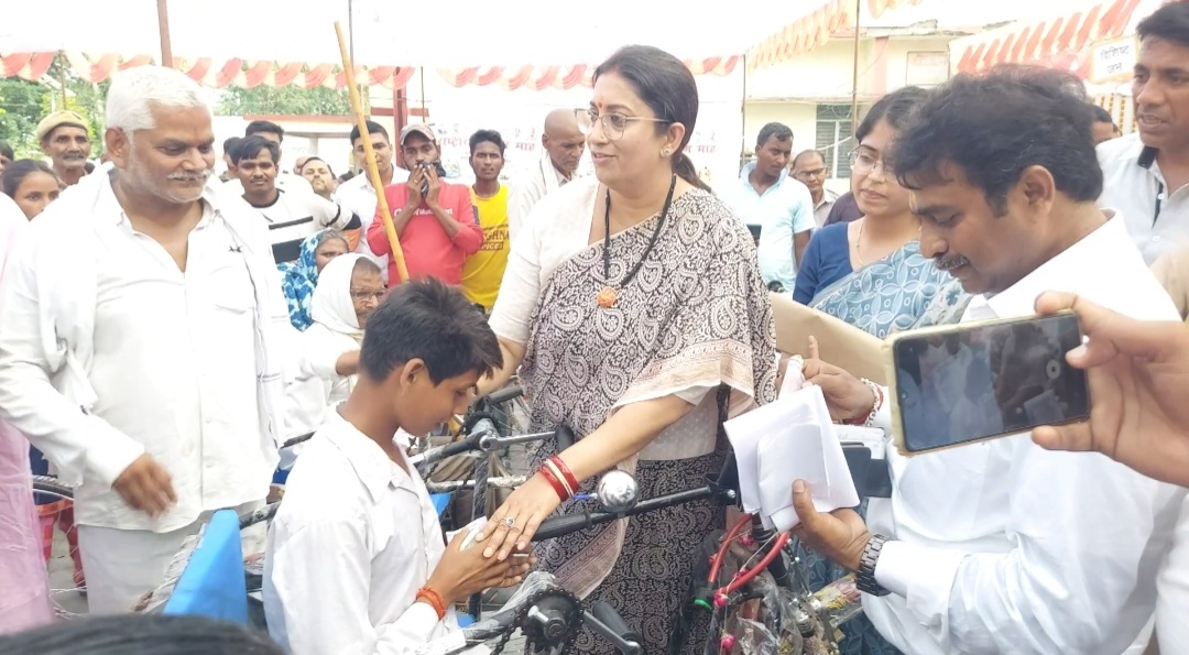भारत सरकार की महिला बाल विकास एवं पुष्टाहार तथा अल्पसंख्यक कल्याण मंत्री व अमेठी सांसद स्मृति जुबिन ईरानी आज एकदिवसीय अपने संसदीय क्षेत्र के दौरे पर थी। इस दौरान वह सबसे पहले मुसाफिरखाना तहसील क्षेत्र अंतर्गत कादू नाला स्थित भाले सुल्तान शहीद स्मारक पहुंची जहां पर अमेठी पुलिस के द्वारा केंद्रीय मंत्री को दिया गया गार्ड आफ ऑनर इसके उपरांत बीजेपी कार्यकर्ताओं ने केंद्रीय मंत्री का किया भव्य स्वागत तत्पश्चात प्रधानमंत्री नरेंद्र मोदी के जन्म दिवस पर आयोजित सेवा पखवाड़ा कार्यक्रम के अंतर्गत बीजेपी किसान मोर्चा द्वारा कराया गया वृहद वृक्षारोपण इसमें केंद्रीय मंत्री स्मृति ईरानी ने भी किया पौधरोपण। वहीं पर भाले सुल्तानियों और बीजेपी नेताओं ने स्मृति ईरानी को नवरात्र के पावन अवसर पर मां दुर्गा की प्रतिमा देकर किया। आज के इस दौरे में अमेठी जनपद वासियों सहित बीजेपी नेताओं एवं कार्यकर्ताओं में खासा उत्साह देखने को मिला जगह जगह पर केंद्रीय मंत्री स्मृति ईरानी का किया गया भव्य स्वागत। तत्पश्चात वह सीधे जनपद मुख्यालय गौरीगंज स्थित कलेक्ट्रेट पहुंची जहां पर उन्होंने गर्भवती महिलाओं की किया गोद भराई कार्यक्रम उसके बाद नवजात शिशुओं को कराया अन्नप्राशन तथा दिव्यांगों को ट्राई साइकिल किया वितरित ट्राई साइकिल वितरण के दौरान केंद्रीय मंत्री स्मृति ईरानी ने एक किशोर दिव्यांग को देखकर वह भावुक हुई और उनसे बात कर उसकी मदद करते हुए कुछ नगद धन भी दिया। कार्यक्रम के अंत में कौशल विकास के द्वारा निकाली जा रही रैली को हरी झंडी देकर किया रवाना। कलेक्ट्रेट से निकलकर तीसरे कार्यक्रम में वह गौरीगंज के सैठा रोड पर बने जिला पंचायत रिसोर्स सेंटर पहुंची जहां पर जिला पंचायत अध्यक्ष राजेश कुमार अग्रहरी जगदीशपुर से बीजेपी विधायक सुरेश पासी और एमएलसी शैलेंद्र प्रताप सिंह ने केंद्रीय मंत्री की उपस्थिति में पूजन अर्चन कर 02 करोड़ 08 लाख 10,000 रुपए की लागत से नवनिर्मित रिसोर्स सेंटर किया का किया उद्घाटन । यहीं से लगभग 22 करोड़ रुपए की लागत से बनने वाली तमाम सड़कों सहित अन्य विकास की 129 परियोजनाओं का किया लोकार्पण एवं शिलान्यास।