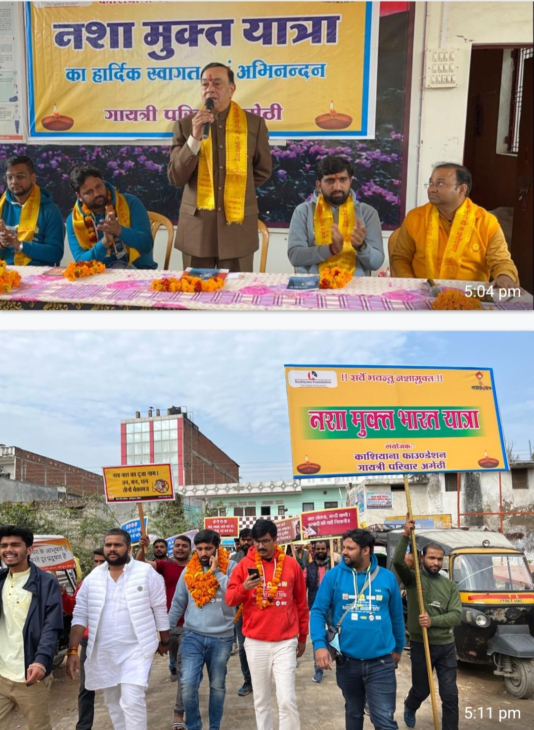 इसके पूर्व गायत्री परिवार अमेठी ने नशामुक्त भारत यात्रा का अमेठी पहुंचने पर जोरदार स्वागत किया। पंजाब नेशनल बैंक पर भारतीय जनता युवा मोर्चा के अध्यक्ष विषुव मिश्रा और श्यामल विश्वास ने अपने साथियों व गायत्री परिवार के कार्यकर्ताओं के साथ काशियाना फाउंडेशन के संस्थापक सुमीत सिंह और उनके साथियों का स्वागत किया। नशामुक्त भारत यात्रा के अगुआ सुमीत सिंह पंजाब नेशनल बैंक से गायत्री शक्तिपीठ अमेठी तक पैदल मार्च करते हुए पहुंचे। युवाओं के हाथों में नशा छोड़ो – परिवार जोड़ो, नशा नाश की जड़ है भाई, इनसे दूर रहो मेरे भाई की तख्तियां थीं और जुबान पर भारत माता की जय, नशा छोड़ो भारत जोड़ो के नारे थे।