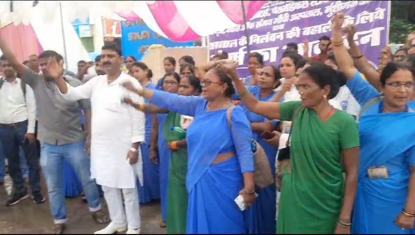संजय गांधी अस्पताल गेट पर सत्याग्रह के तीसरे दिन बारिश में भीगते हुए कर्मचारियों ने आवाज की बुलंद।