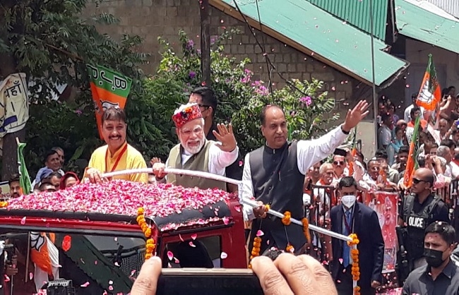 धर्मशाला। प्रधानमंत्री नरेन्द्र मोदी हिमाचल प्रदेश के दो दिवसीय दौर पर गुरुवार दोपहर 12 बजे हेलीकॉप्टर से धर्मशाला के साई मैदान पहुंचे। उन्होंने हिमाचल प्रदेश स्कूल शिक्षा बोर्ड मुख्यालय से अपना रोड शो शुरू किया जो केसीसी बैंक चौक पर समाप्त हुआ। करीब आठ मिनट के रोड शो के दौरान सड़क के दोनों तरफ हजारों की संख्या में खड़े भाजपा कार्यकर्ताओं ने पुष्प वर्षा कर प्रधानमंत्री का स्वागत किया। इस दौरान पीएम मोदी खुली जीप से लोगों का अभिवादन करते रहे। उनके साथ मुख्यमंत्री जयराम ठाकुर, प्रदेश भाजपा अध्यक्ष सुरेश कश्यप जीप में सवार थे।