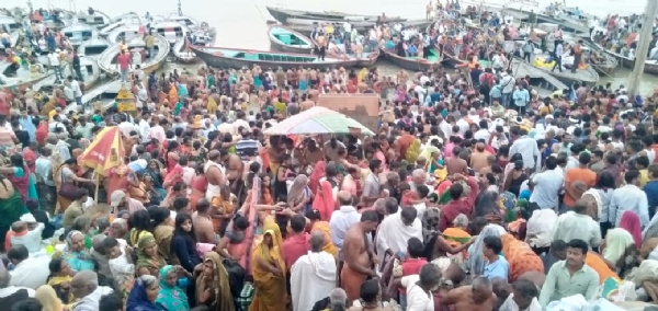 वाराणसी: सूर्य ग्रहण के मोक्षकाल में गंगा स्नान के लिए उमड़ा जनसैलाब