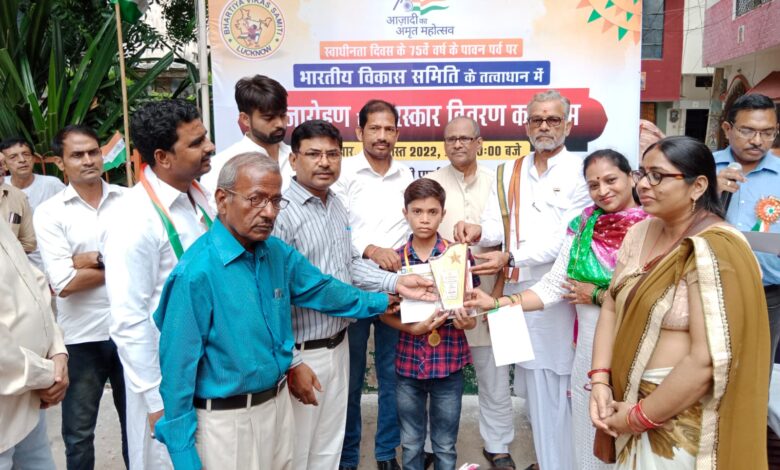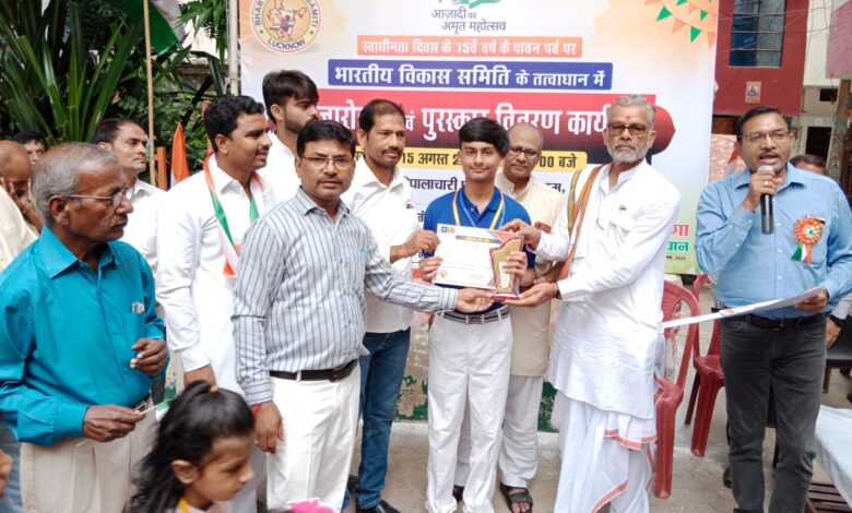 लखनऊ: आज़ादी के 75वें “स्वतंत्रता दिवस” के पावन पर्व पर “भारतीय विकास समिति” के तत्वावधान में “ध्वजारोहण” एवं आर्ट प्रतियोगिता के प्रतिभागियों को “पुरस्कार वितरण कार्यक्रम” का आयोजन सी.राज गोपालाचारी पार्क, राजाजीपुरम में आयोजित किया गया। कोरोना वॉरियर्स/सामाजिक कार्यकर्ता एवं समिति के अध्यक्ष रामगोपाल सिंह ने ध्वजारोहण किया। मौके पर मौजूद जनसमूह ने “तिरंगा मार्च” कर वंदेमातरम और भारत माता की जयघोष से समस्त वातावरण में उत्साह और जोश से लोगों ने अपने आपको गौरवान्वित महसूस किया।