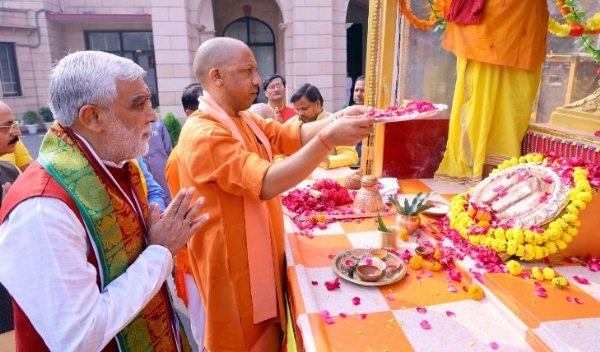 लखनऊ। उत्तर प्रदेश के मुख्यमंत्री योगी आदित्यनाथ गुरुवार को श्रीराम चरण पादुका पूजन कार्यक्रम में शामिल हुए। इस दौरान केंद्रीय मंत्री अश्विनी चौबे, परिवहन मंत्री दयाशंकर सिंह एवं साधु-संत मौजूद रहे।