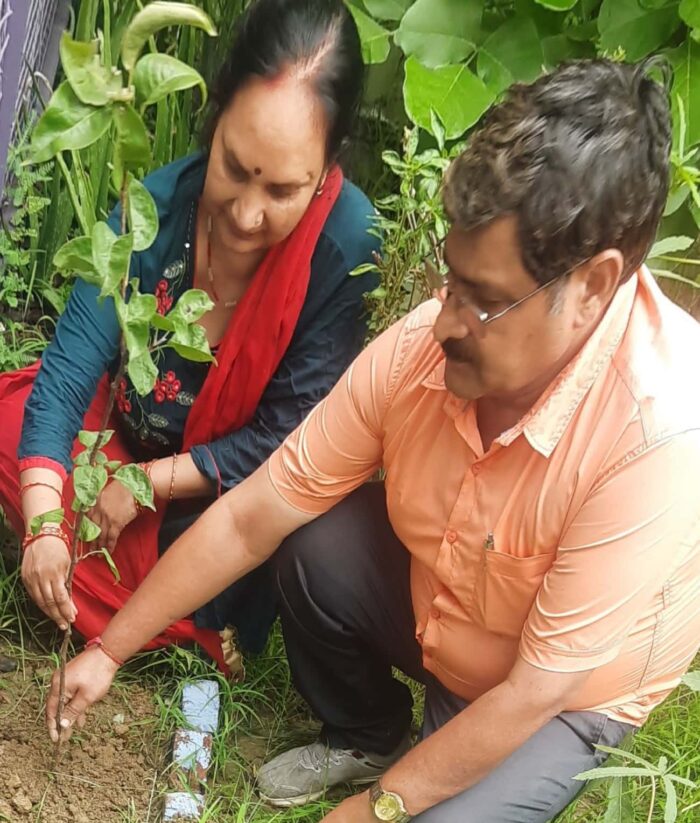 गोंडा संचार विहार आइटीआइ मनकापुर में सन्तोष बाजपेयी अपनी लान में नाशपाती का पौध पत्नी अनुपम के साथ रोपित किया।